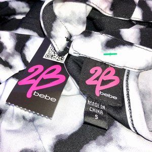 2b Bebe black & white sleeveless dress. Style name 'Tribal Ink Chain Trim Dress'. Polyester & Spandex.