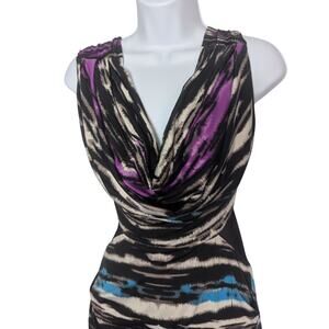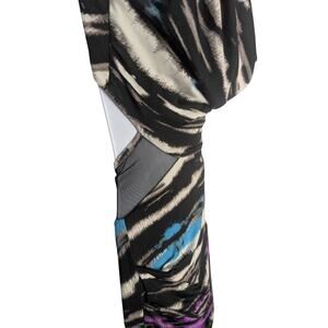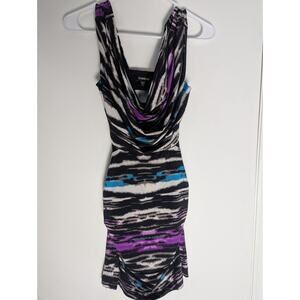 Bold and eye-catching, this bodycon mini dress is a true Y2K statement piece. Featuring a draped cowl neckline, ruched sides, and a daring open back with mesh contrast panels, it’s designed to flatter and turn heads. The stretchy polyester-spandex blend ensures comfort while maintaining a figure-hugging silhouette. With its vibrant mix of purple, blue, and neutral tones, this dress is perfect for cocktail parties, club nights, or festival weekends. Style it with strappy heels and layered jewelry for a glam evening look or with boots and a leather jacket for a retro edge. Ideal for upcoming fall events, homecoming parties, and night-out occasions.