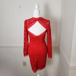 Bebe Dress XS Womens Red Lace Mini Cocktail Party Floral Open Back Vneck Fairy