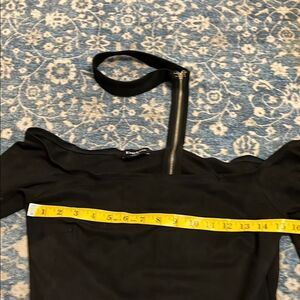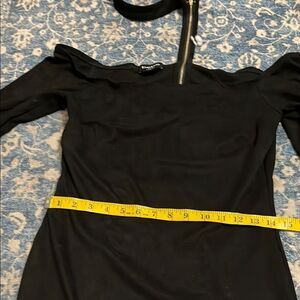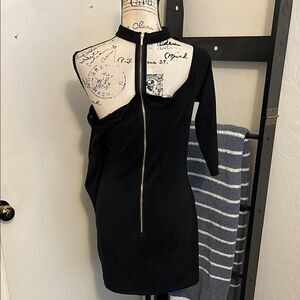 This chic black one-shoulder dress is perfect for any occasion. Its sleek design offers a modern and sophisticated look. Please note; a stain on one sleeve.