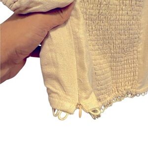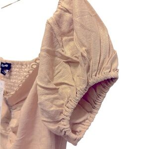 Made in shimmering metallic linen, this cropped blouse is designed to be worn on or off the shoulder for a flirty warm-weather look. Complete with a ruched sweetheart neckline, short sleeves, and delicate picot trim, you can pair this style with the Metallic Linen Trim Detail Short.