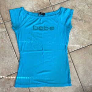 This chic blue t-shirt by Bebe showcases a fitted silhouette with short sleeves, ideal for a stylish casual look. Crafted from a soft, stretchy fabric, it ensures comfort and a flattering fit. The classic crew neck and prominent brand logo on the front add a touch of sophistication to this versatile top.
