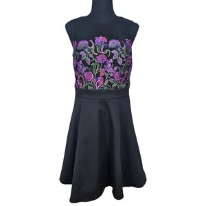 beautiful floral embroidered top, flare skirt, mesh detail, sleeveless, open back, back zipper closure with keyhole button, lined