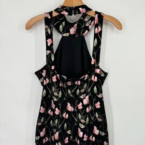 Bebe Floral Print Halter Black & Pink metallic floral Midi Dress size 12 womens