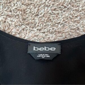 Bebe Flutter Sleeve Blouse. Size small. Tie front. Pretty shiny silver buttons. V neckline, a bit of a deeper neckline. Darted bust area, sexy look. Sheer short sleeves. In excellent condition, only worn once! Would be so cute with jeans, ankle booties, and a hat. Originally $70.