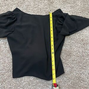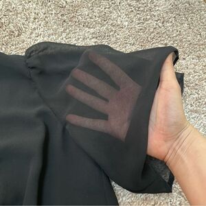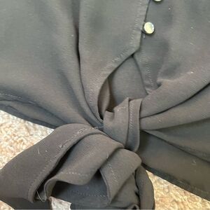 Bebe Flutter Sleeve Blouse. Size small. Tie front. Pretty shiny silver buttons. V neckline, a bit of a deeper neckline. Darted bust area, sexy look. Sheer short sleeves. In excellent condition, only worn once! Would be so cute with jeans, ankle booties, and a hat. Originally $70.
