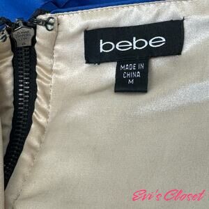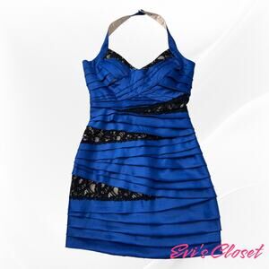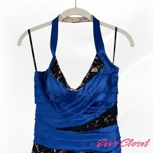 Bebe Formal Banda Style Dress Formal Cocktail Royal Blue With Black Lace And Nude Lining Sweetheart Neckline Halter Neck Buttons Bandages Have Shredded Look. In The Back With Two Settings. Zip Up Back Boning In the Chest. Satin Look. Size M