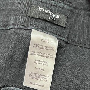 Bebe Girls black denim overalls with factory distressing in front. Metal hardware, pockets, stretch, good condition. Size XL 16.