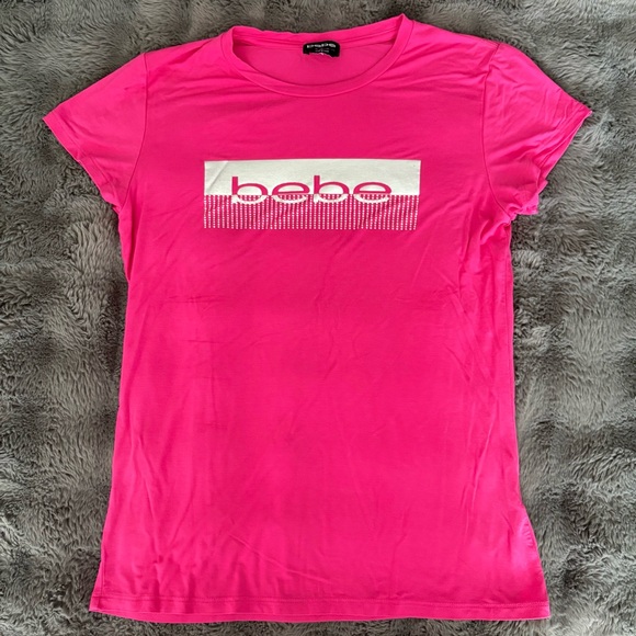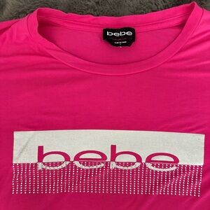 NWOT Bebe Size L Silver Graphic Rhinestone Logo Hot Pink Tee