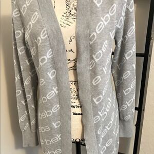 Bebe Gray Logo Open Style Cardigan Sweater, size medium. Please note; has signs of wear & piling.