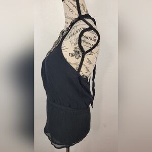 Bebe Halter Top Small 100% Silk Embellished Belted Open Back Black