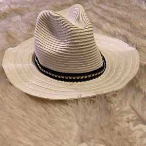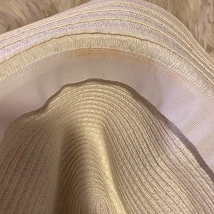 Stylish hat! Ordered it but it is on the small side! Never been worn. A small makeup stain on the inside front which is pictured. Trim is with gold studs!