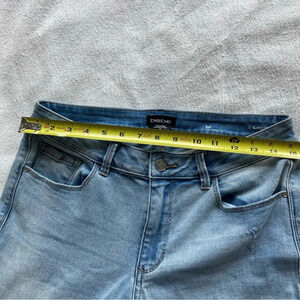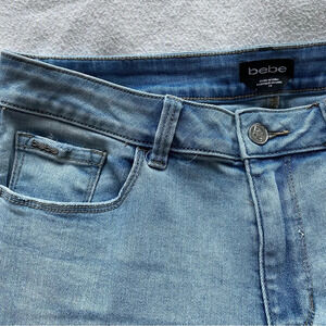 Bebe light wash Heartbreaker skinny jeans in good condition! Raw hem leg openings. Dark blue hearts with rhinestone studded detail on back pockets. Some rhinestones have fallen off.