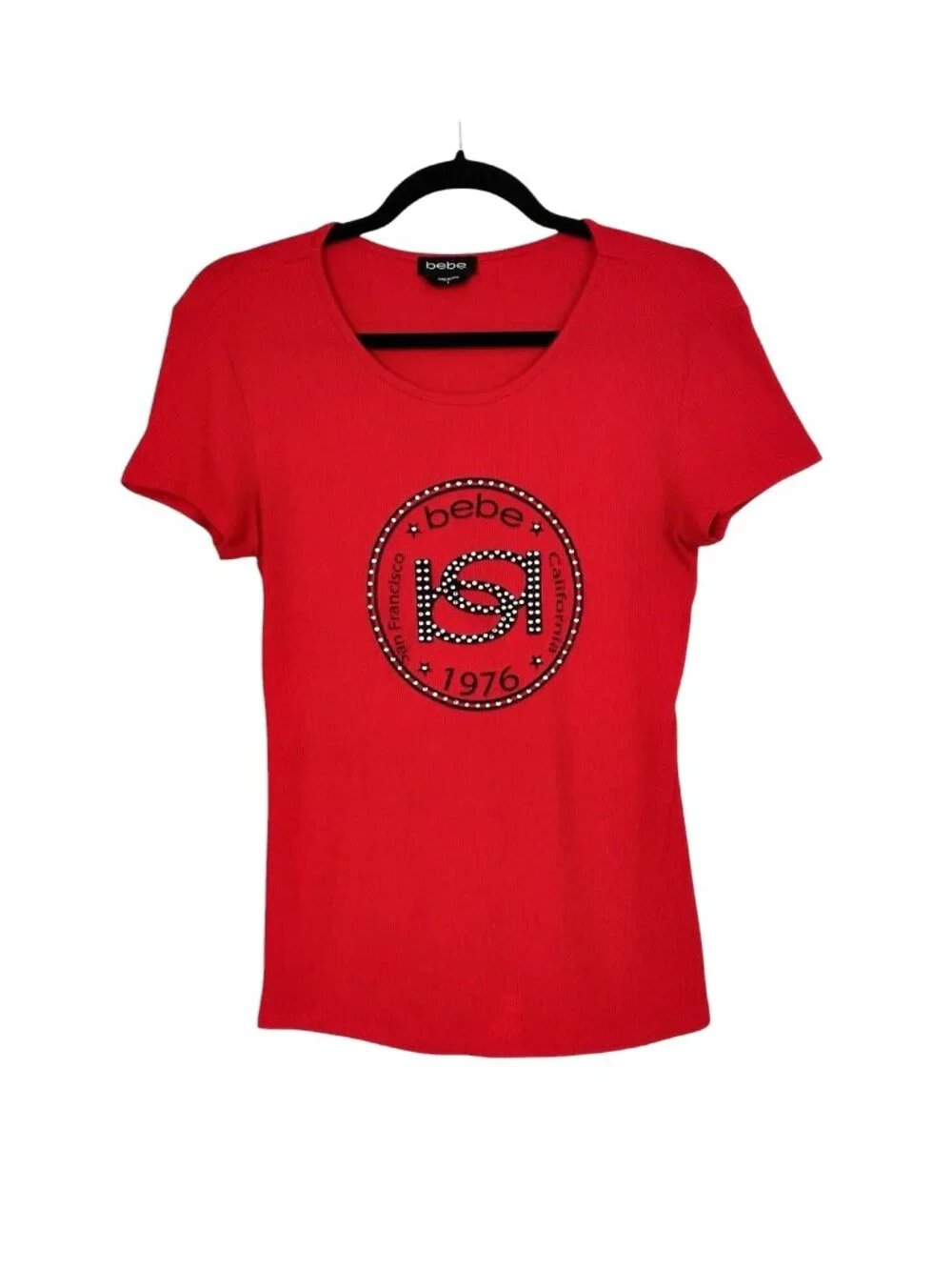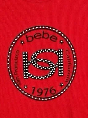 Bebe Red Black Rhinestone Logo San Francisco California 1976 Front Graphic Round Neck Short Sleeve Straight Hem Stretch Ribbed Interlock Knit Tee Minimalist Retro Vintage Inspired Lightweight Top Size Small - Excellent condition.