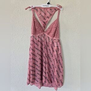 Elevate your sleepwear game with this stunning Bebe Intimates lingerie set. The babydoll style top with a V-neckline and adjustable straps is made of sheer lace material, providing a sexy and elegant look. The set comes in a beautiful blush color with accents of the brand's logo.
