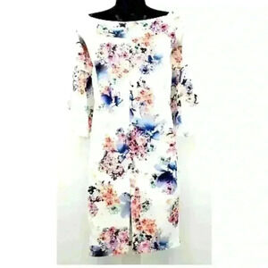 Bebe Ivory Multi Colorful Floral Print Dress •New with tags size 10 •Off Shoulder Style •Bell Sleeves •Form fitting and figure flattering •Stretchy