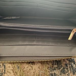 Gray zip wallet. New with tag. Never worn. Gold stud embellishment around front of wallet. bebe in gold. Card holders and zip inside wallet. Small indentions from being in storage, see photos.