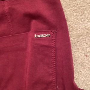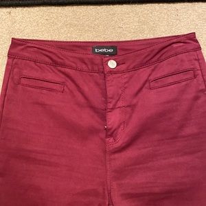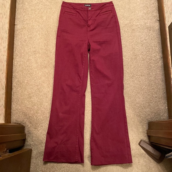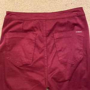 Waist 28 inches, hips up to 37, 41 inches from waist to hem, 30 inseam, burgundy stretch denim material. Worn only once. Size 28 equivalent to a 2-4.