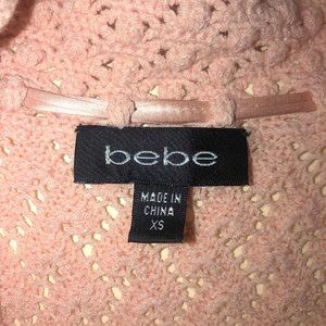 This Bebe Cardigan is a very cute dusty rose color with a satin ribbon tie. Size is XS but can fit comfortably on a M body depending on the look you want!