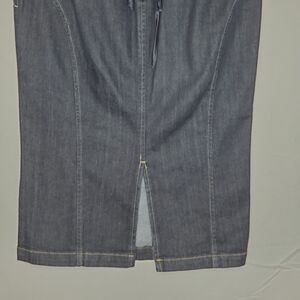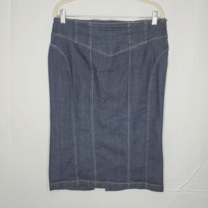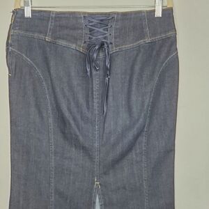 Bebe Corset Back Jean Skirt Size 31. Lace-up denim skirt with contrast stitching has a bit of stretch and back slit for ease of movement. Made in U.S.A.
