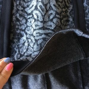 Total power dress in a leopard jacquard knit with slimming contrast trim. Long sleeves. Hidden back hook-and-eye and zip closure.