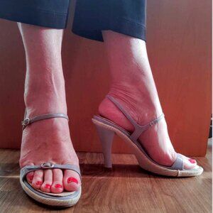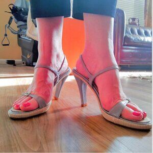 These Bebe high heel sandals feature an almond toe shape with a buckle closure, designed in a light blue leather and natural linen color fabric. The strappy style is perfect for summer or spring occasions, such as parties or casual outings. US shoe size 9M.