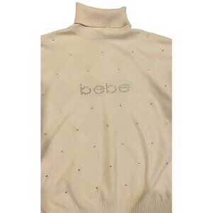 Chic turtleneck sweater by Bebe. Light cream color with subtle embellishments. Ideal for a cozy, fashionable look.