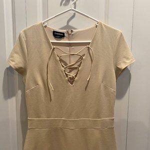 Bebe Light Tan Neckline Lace Up Dress Size Large. Back Zip Closure.