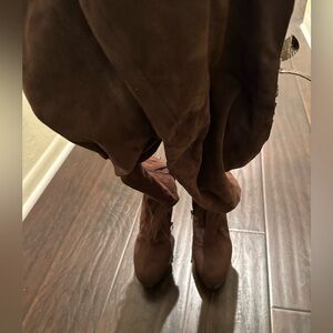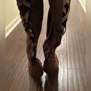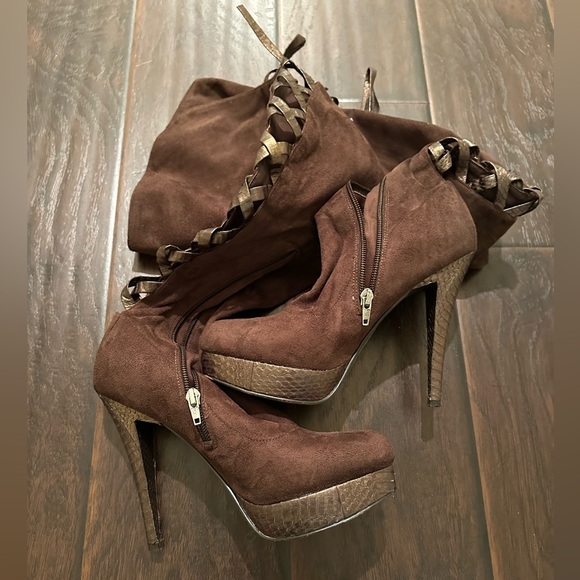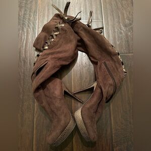 Size 8. Over the knee. Lace up back w/ bow. Suede. 5” heel w/ 1” platform.