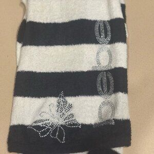 Stylish black and white striped scarf featuring elegant embellishments. Perfect for adding a touch of sophistication to any outfit.