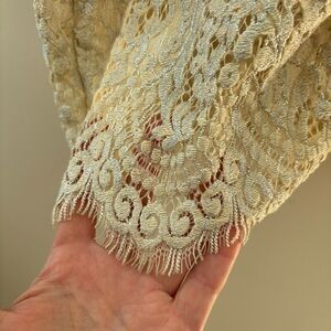 Stunning midi dress in an elegant frond lace finished with subtle metallic shimmer.