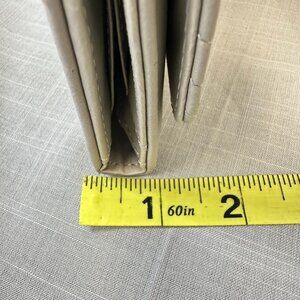 This wallet is in new condition with tags still attached. It has a nice soft gray (almost cream) color in what feels like leather (I don't know what it's made out of). Very soft and supple, it has gold tone stud details. Trifold wallet with snap enclosure- no outer pocket. It measures about 4-1/2" by 7-1/2" by 1". It also has some nice stitching detail on the front.