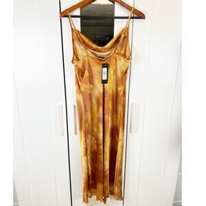 Bebe NWT Watercolor Tie Dye Satin Cowl Neck Slip Midi Dress in Tan Size Large