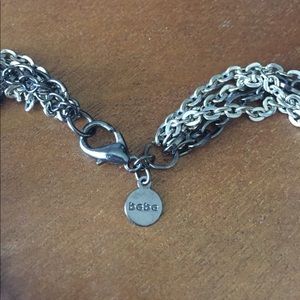 Gunmetal/silver chains with (2) crosses & pearl like strand all in one.