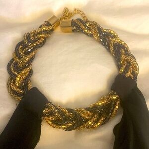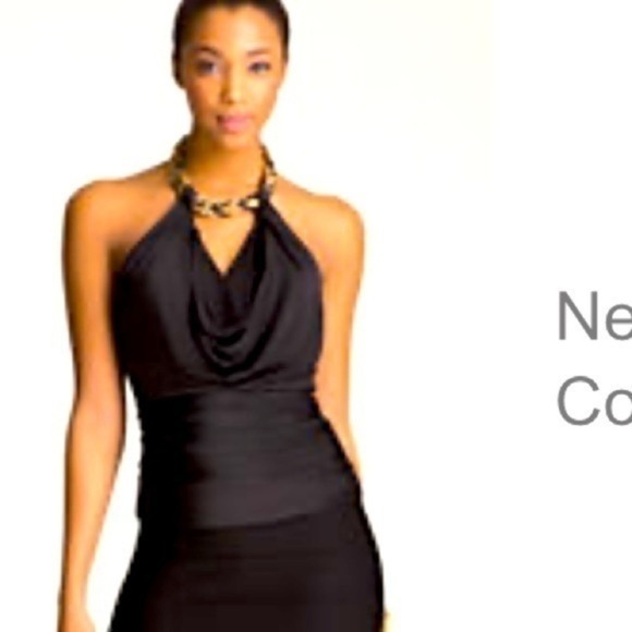 Black colored satiny fabric, beautiful gold and gunmetal halter/necklace. Very feminine and figure hugging with ruched detail on the bottom. New Beautiful for a night out!