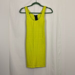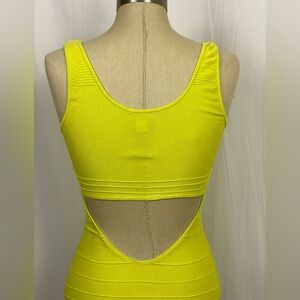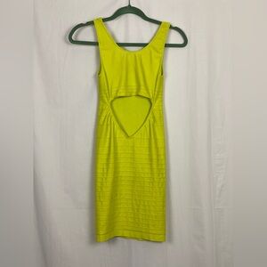 Bebe dayglo neon yellow bodycon dress with super stretchy fit and cutout in the back. Excellent condition. B 11.5-20” W 11-18.5” L 32”