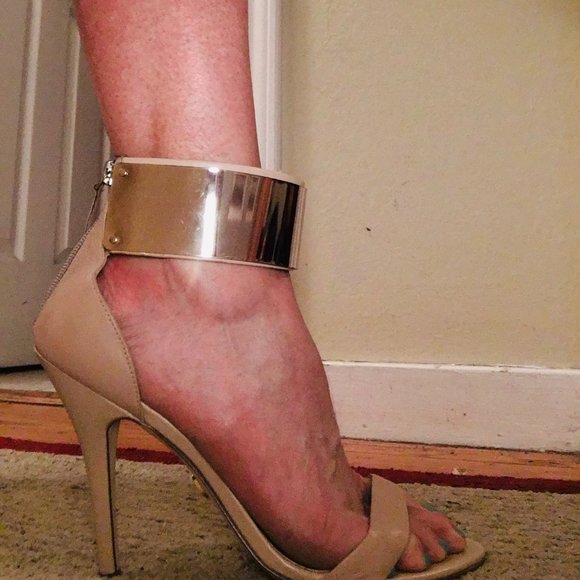 4.5 inch stiletto from Bebe. Solid gold high ankle strap - easy to walk in and ok for nights out. Gently used.