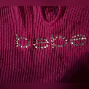 Size Small. The logo is missing some rhinestones but you can’t really tell unless you look really close. No other flaws, see photos for details