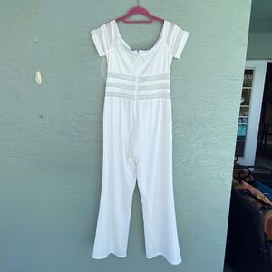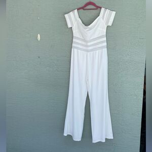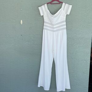 Bebe OFF SHOULDER MESH PANEL JUMPSUIT Sz M worn Once see last picture for Marks