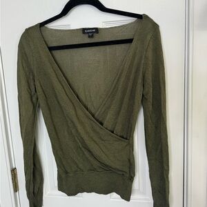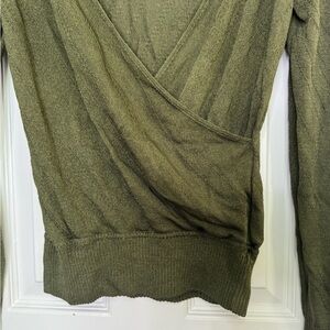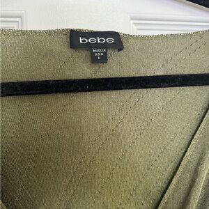 Stylish wrap sweater by Bebe. Features a deep V-neck. Perfect for layering.