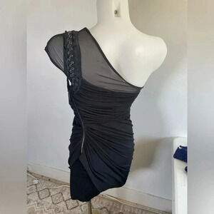 Bebe One Shoulder Black Mini Dress Bodycon Chain Cocktail Little Black Dress 046