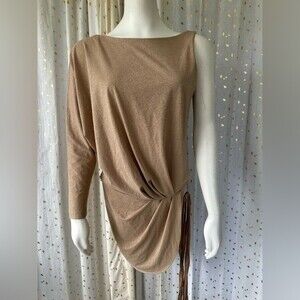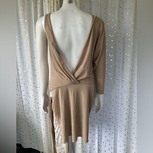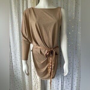 Bebe One Sleeve Metallic Gold Bodycon Dress Belt Tie Plunging Open Back XS