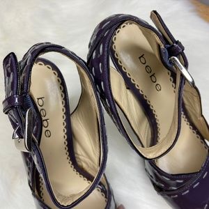 Bebe purple patent leather peep toe platform heels. Minimal wear. In great condition. Small scuff at the toe of left heel (photographed) hardly noticeable