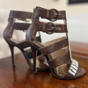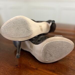 Almost new, these size 7 heels exhibit some peeling on the inside, as shown in the pictures. The outside of the heel is in excellent condition, and they feature a convenient zipper back closure. With a heel height of 4.5 inches, these heels retail for 159.00.