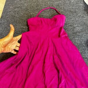 This captivating pink sundress by Bebe features a spaghetti strap neckline and cap sleeves, perfect for a prom or cocktail event. The fit-and-flare silhouette offers a flattering shape, with a fitted bodice and a full, flowing skirt that adds a touch of elegance. Its vibrant pink hue ensures you'll stand out in any crowd.