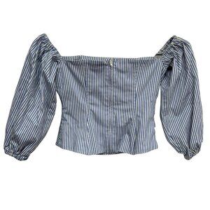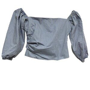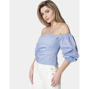 Bebe Women's Poplin Off Shoulder Bubble Sleeves Blue White Striped Stretch Top Size 2 Ruched Cotton Nautical Date Night Beach Breathable