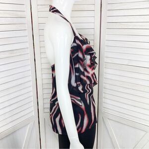 Bebe Printed Silk Chiffon Ruffle Trim Halter Neck Blouse Pink Black XS