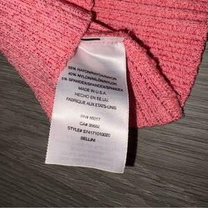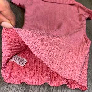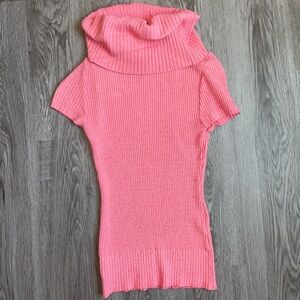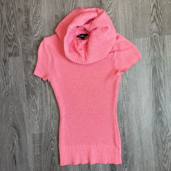 Chic coral knit pullover by Bebe. Perfect short-sleeve top for layering with a cowl neck. The top is a ribbed knit with short sleeves and a cowl neck, which is a type of relaxed turtleneck.