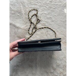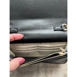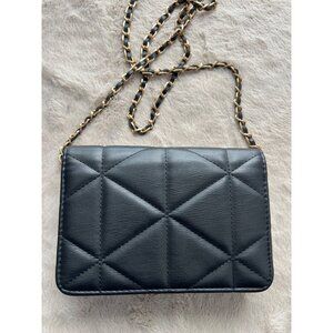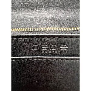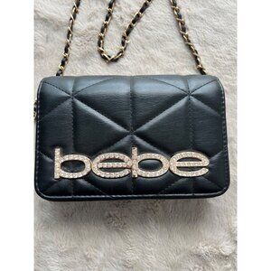 Bebe Quilted Black Leather Crossbody Purse With Gold Chain Strap & Rhinestone Lo