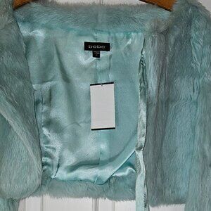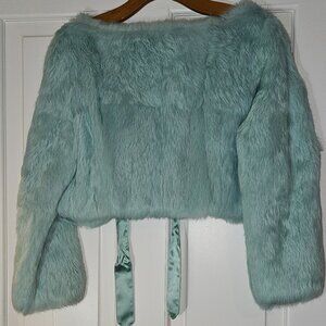 Cute! Cute! Never worn Bebe rabbit fur jacket with silk tie. Also has a concealed hook and eye top closure and 3/4 in sleeves. This cute little jacket is sure to amp up any outfit! Size M
